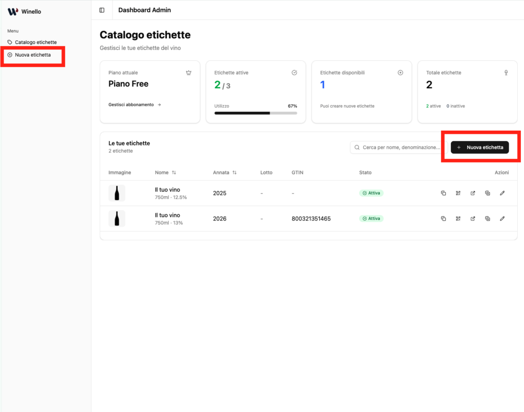 Per creare un’etichetta, effettua l’accesso al sito Winello e dalla schermata principale puoi fare click su uno dei tasti evidenziati in rosso di seguito