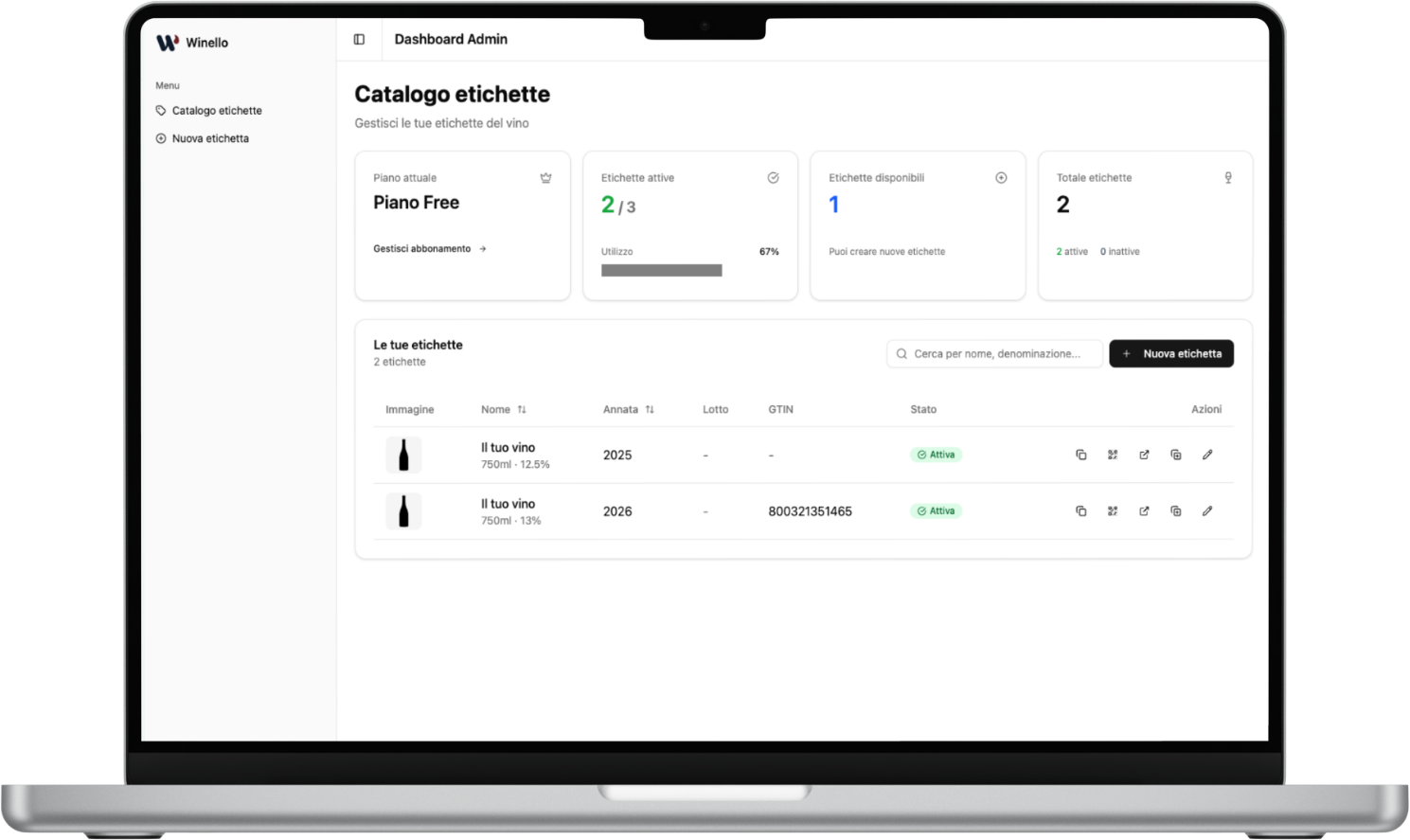 Prova la potenza di Winello senza impegno. Crea le tue prime 3 etichette e mettiti subito in regola